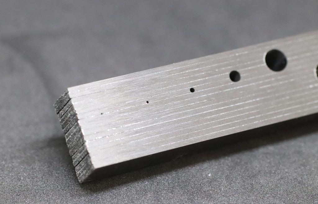 積層された素材を切削加工にて引き直し、φ0.25~φ5までの微細孔開け加工を施しております。